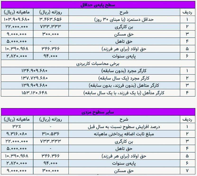 این مقادیر برای تمامی کارگاهها و کارفرمایان لازمالاجراست و مبنای محاسبه دستمزد کارگران در سال ۱۴۰۴ میباشد.